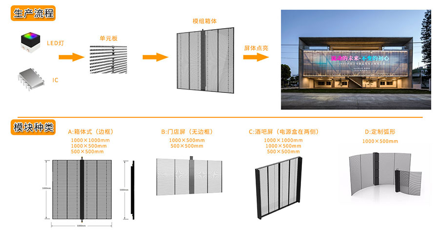 The transparent screen used in the project is the transparent LED screen designed by Front-Transparent Led Screen. Front-Transparent Led Screen is a kind of transparent LED screen. It is a transparent LED display module designed by the positive paste process. The positive paste LED lamp design has a smoother surface, which is also called positive light-emitting transparent screen, ice screen, transparent screen and led transparent screen; Modular design, free splicing; High permeability and fast installation; Aluminum alloy profile design is more conducive to heat dissipation, lighter weight, convenient installation and maintenance, and saves the cost of steel structure; Ultra thin design, more beautiful after installation. Hoisting, vertical installation, back support and other installation methods can be adopted. Brightness has high and low brightness. The products are box type and frameless type; The products have standard sizes of 1000X1000mm, 1000x500mm and 500x500mm. Other shapes and sizes such as arc, cylinder and circle can be customized.